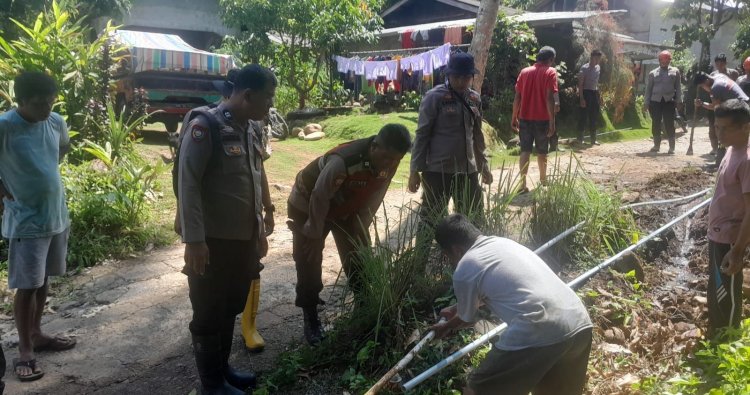 Sejumlah personel turut terlibat aktif turun ke lapangan, membaur bersama masyarakat memperbaiki alur saluran air agar kembali berfungsi optimal.